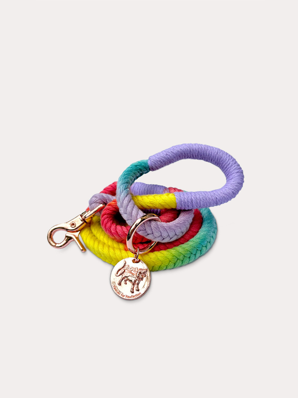 The Rainbow leash is a cotton-braided rope of multi-coloured hues inspired by the colourful personalities of our fur babies.